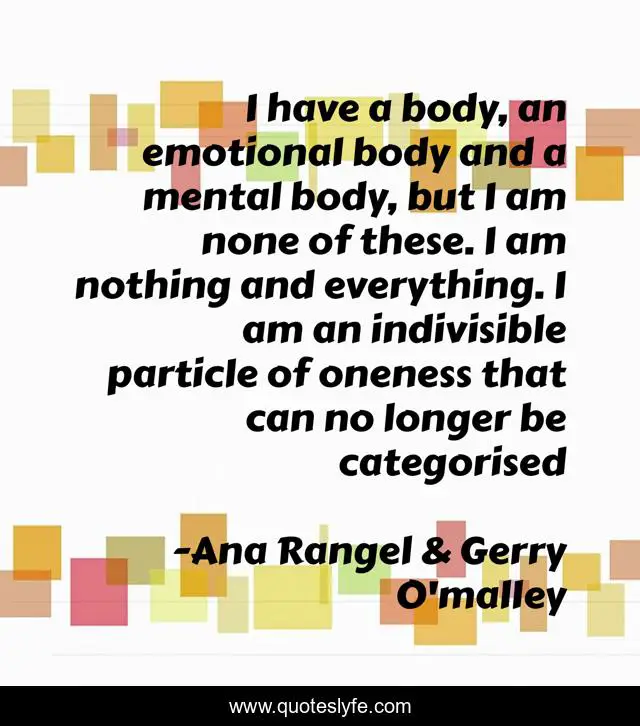 This page presents the quote "I have a body, an emotional body and a mental body, but I am none of these. I am nothing and everything. I am an indivisible particle of oneness that can no longer be categorised". Author of this quote is Ana Rangel & Gerry O'malley. This quote is about spirituality, what-am-i,.