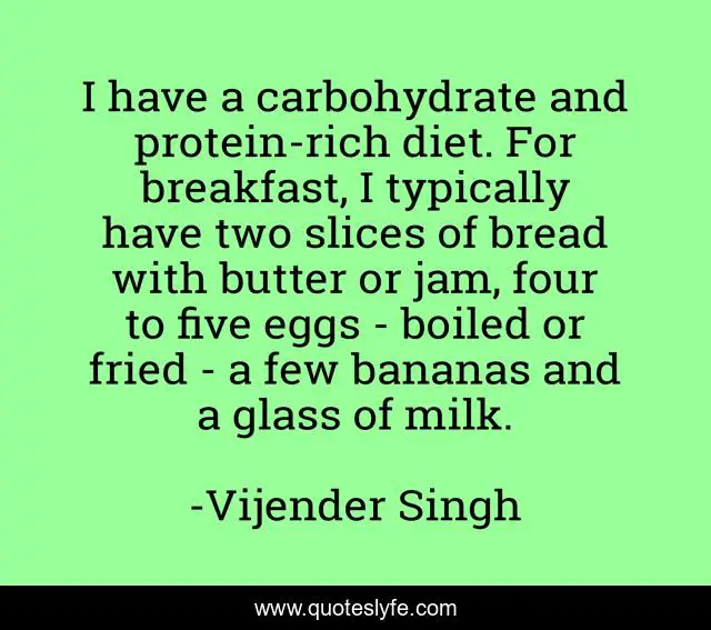 This page presents the quote "I have a carbohydrate and protein-rich diet. For breakfast, I typically have two slices of bread with butter or jam, four to five eggs - boiled or fried - a few bananas and a glass of milk.". Author of this quote is Vijender Singh. This quote is about glass, breakfast, bread,.