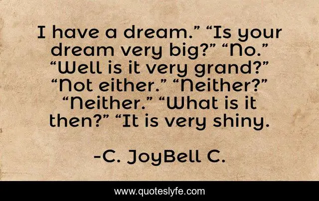 This page presents the quote "I have a dream.” “Is your dream very big?” “No.” “Well is it very grand?” “Not either.” “Neither?” “Neither.” “What is it then?” “It is very shiny.". Author of this quote is C. JoyBell C.. This quote is about inspiring, heartwarming, dreams-inspirational, inspirational-attitude, inspirational, dreaming, inspirational-life, enthusiasm, sweet,.