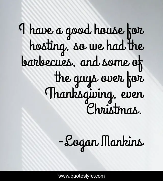 This page presents the quote "I have a good house for hosting, so we had the barbecues, and some of the guys over for Thanksgiving, even Christmas.". Author of this quote is Logan Mankins. This quote is about house, good, thanksgiving,.
