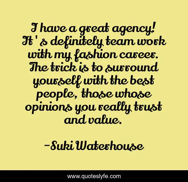 This page presents the quote "I have a great agency! It's definitely team work with my fashion career. The trick is to surround yourself with the best people, those whose opinions you really trust and value.". Author of this quote is Suki Waterhouse. This quote is about work, best, team,.