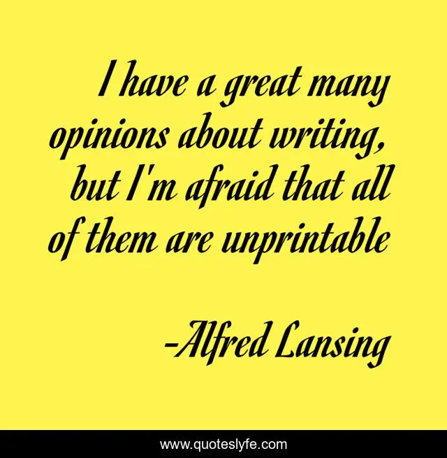 This page presents the quote "I have a great many opinions about writing, but I'm afraid that all of them are unprintable". Author of this quote is Alfred Lansing. This quote is about writing, writing-humor, writing-life, writing-advice,.