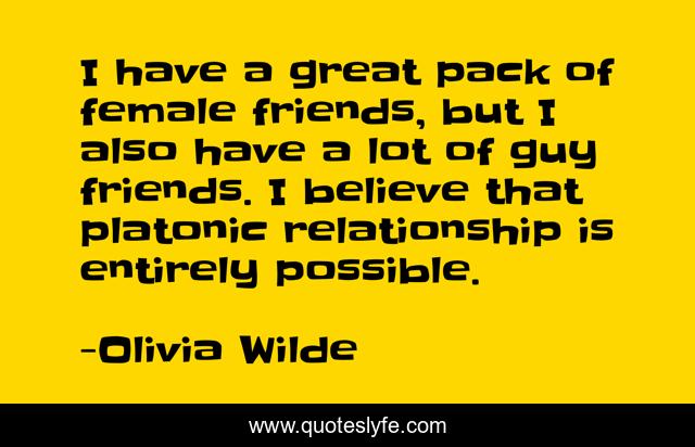 This page presents the quote "I have a great pack of female friends, but I also have a lot of guy friends. I believe that platonic relationship is entirely possible.". Author of this quote is Olivia Wilde. This quote is about great, believe, friends,.