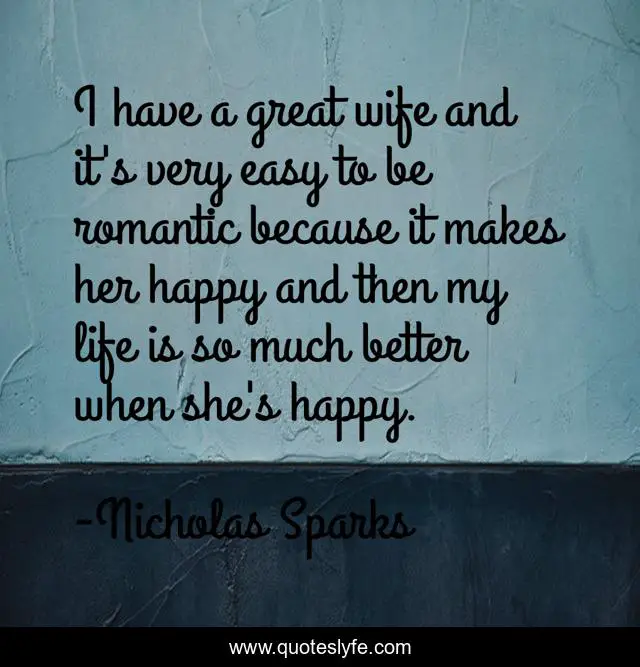 This page presents the quote "I have a great wife and it's very easy to be romantic because it makes her happy and then my life is so much better when she's happy.". Author of this quote is Nicholas Sparks. This quote is about life, great, happy,.