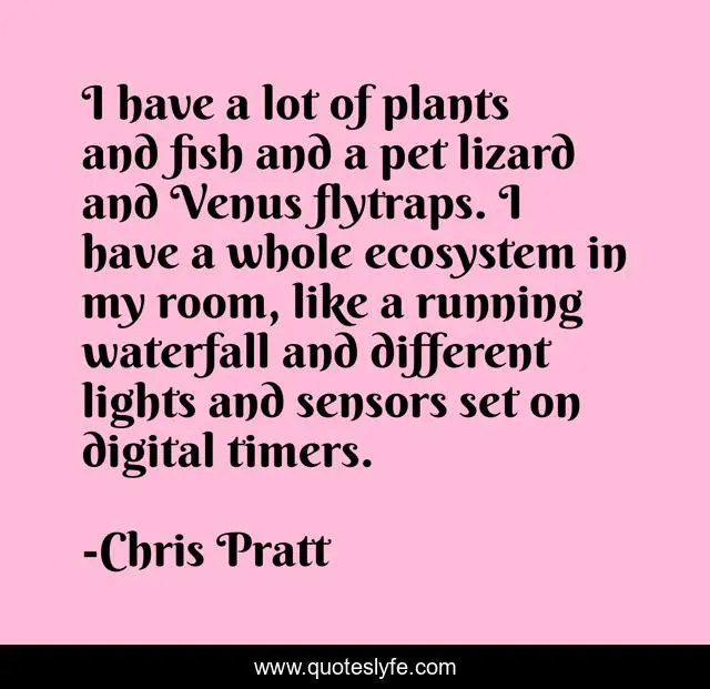 This page presents the quote "I have a lot of plants and fish and a pet lizard and Venus flytraps. I have a whole ecosystem in my room, like a running waterfall and different lights and sensors set on digital timers.". Author of this quote is Chris Pratt. This quote is about plants, fish, digital,.