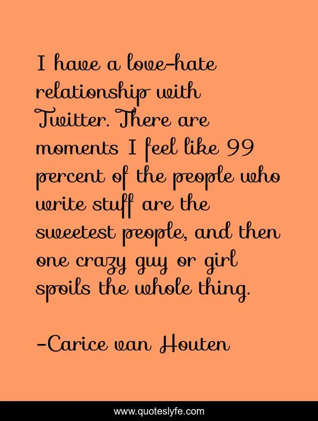 This page presents the quote "I have a love-hate relationship with Twitter. There are moments I feel like 99 percent of the people who write stuff are the sweetest people, and then one crazy guy or girl spoils the whole thing.". Author of this quote is Carice van Houten. This quote is about moments, girl, crazy,.