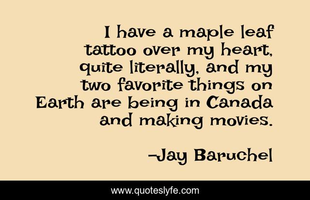 This page presents the quote "I have a maple leaf tattoo over my heart, quite literally, and my two favorite things on Earth are being in Canada and making movies.". Author of this quote is Jay Baruchel. This quote is about heart, leaf, earth,.