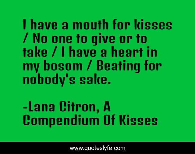 This page presents the quote "I have a mouth for kisses / No one to give or to take / I have a heart in my bosom / Beating for nobody's sake.". Author of this quote is Lana Citron, A Compendium Of Kisses. This quote is about loneliness, kiss,.