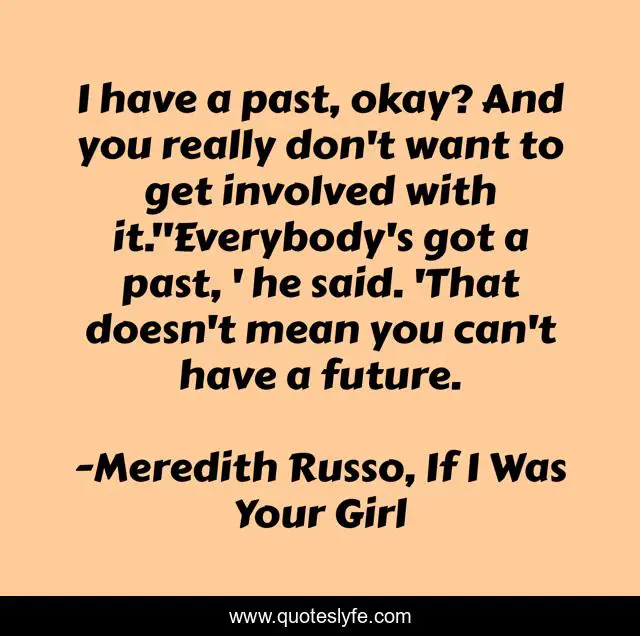 This page presents the quote "I have a past, okay? And you really don't want to get involved with it.''Everybody's got a past, ' he said. 'That doesn't mean you can't have a future.". Author of this quote is Meredith Russo, If I Was Your Girl. This quote is about past, future,.