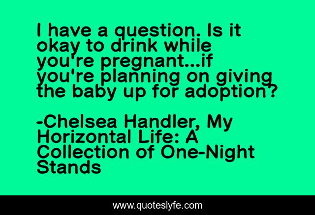 This page presents the quote "I have a question. Is it okay to drink while you're pregnant...if you're planning on giving the baby up for adoption?". Author of this quote is Chelsea Handler, My Horizontal Life: A Collection of One-Night Stands. This quote is about pregnancy, drinking, humor, alcohol,.