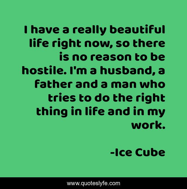 This page presents the quote "I have a really beautiful life right now, so there is no reason to be hostile. I'm a husband, a father and a man who tries to do the right thing in life and in my work.". Author of this quote is Ice Cube. This quote is about beautiful, life, father,.