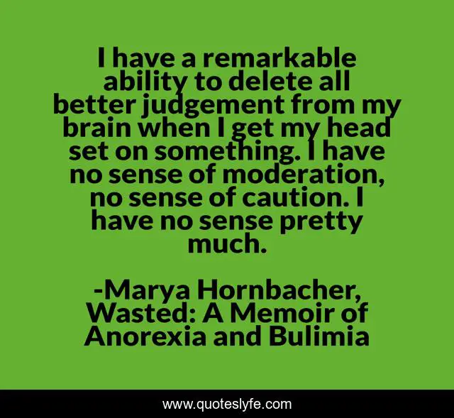 This page presents the quote "I have a remarkable ability to delete all better judgement from my brain when I get my head set on something. I have no sense of moderation, no sense of caution. I have no sense pretty much.". Author of this quote is Marya Hornbacher, Wasted: A Memoir of Anorexia and Bulimia. This quote is about bulimia, eating-disorder, marya-hornbacher, wasted, memoir, anorexia,.