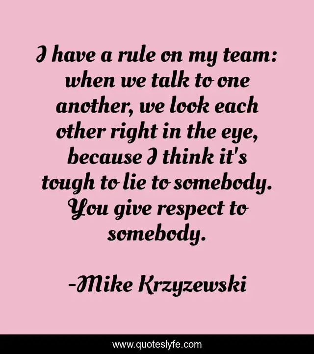 This page presents the quote "I have a rule on my team: when we talk to one another, we look each other right in the eye, because I think it's tough to lie to somebody. You give respect to somebody.". Author of this quote is Mike Krzyzewski. This quote is about lie, eye, team,.
