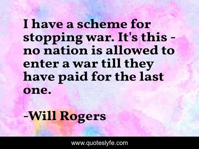 This page presents the quote "I have a scheme for stopping war. It's this - no nation is allowed to enter a war till they have paid for the last one.". Author of this quote is Will Rogers. This quote is about last, paid, nation,.