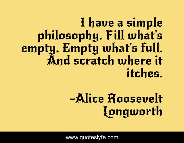 This page presents the quote "I have a simple philosophy. Fill what's empty. Empty what's full. And scratch where it itches.". Author of this quote is Alice Roosevelt Longworth. .