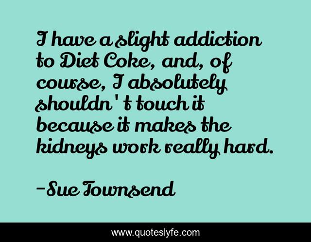 This page presents the quote "I have a slight addiction to Diet Coke, and, of course, I absolutely shouldn't touch it because it makes the kidneys work really hard.". Author of this quote is Sue Townsend. This quote is about touch, addiction, work,.