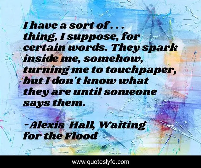 This page presents the quote "I have a sort of . . . thing, I suppose, for certain words. They spark inside me, somehow, turning me to touchpaper, but I don't know what they are until someone says them.". Author of this quote is Alexis Hall, Waiting for the Flood. This quote is about touchpaper, words,.