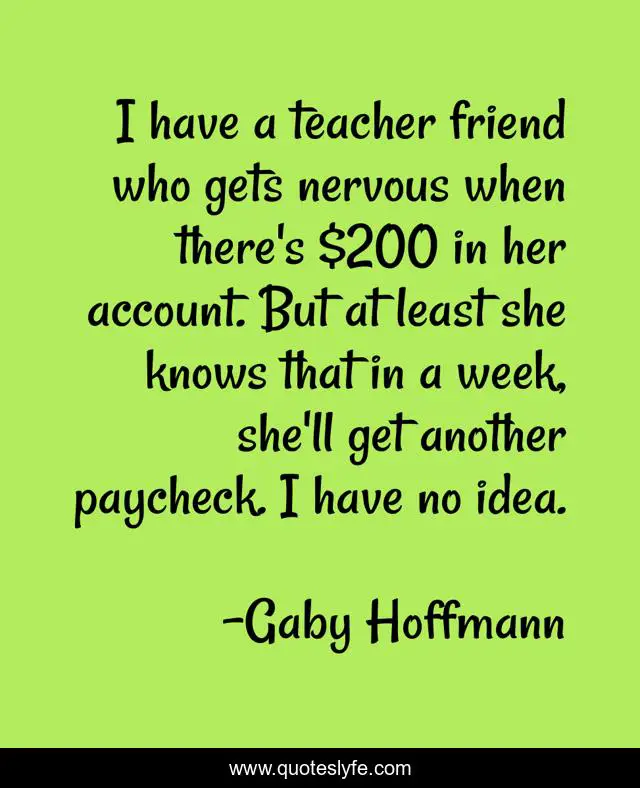 This page presents the quote "I have a teacher friend who gets nervous when there's $200 in her account. But at least she knows that in a week, she'll get another paycheck. I have no idea.". Author of this quote is Gaby Hoffmann. This quote is about week, she, friend,.