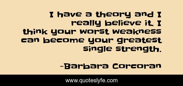 This page presents the quote "I have a theory and I really believe it. I think your worst weakness can become your greatest single strength.". Author of this quote is Barbara Corcoran. This quote is about weakness, believe, greatest,.
