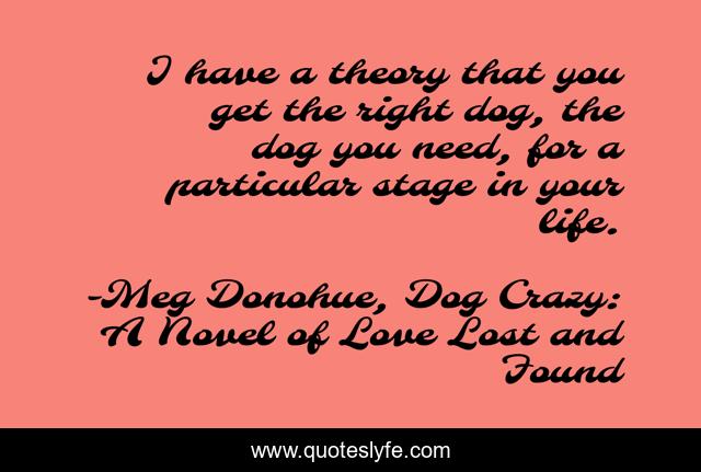 This page presents the quote "I have a theory that you get the right dog, the dog you need, for a particular stage in your life.". Author of this quote is Meg Donohue, Dog Crazy: A Novel of Love Lost and Found. This quote is about dogs, dogs-and-humans,.