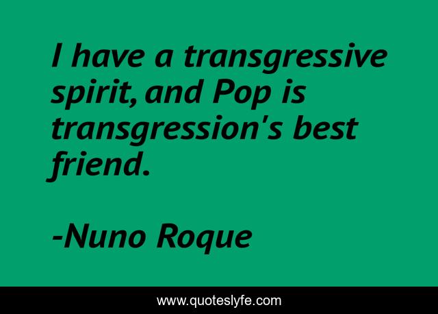 This page presents the quote "I have a transgressive spirit, and Pop is transgression's best friend.". Author of this quote is Nuno Roque. This quote is about artistry, transgressions, artistic-expression, artistic-endeavor, pop-music, rebelliousness, artists, pop-art, best-friend,.