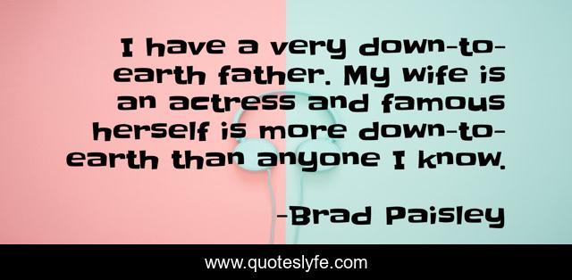 This page presents the quote "I have a very down-to-earth father. My wife is an actress and famous herself is more down-to-earth than anyone I know.". Author of this quote is Brad Paisley. This quote is about father, wife,.