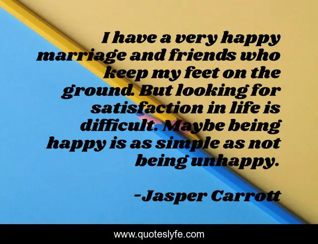 This page presents the quote "I have a very happy marriage and friends who keep my feet on the ground. But looking for satisfaction in life is difficult. Maybe being happy is as simple as not being unhappy.". Author of this quote is Jasper Carrott. This quote is about life, friends, happy,.