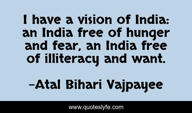 This page presents the quote "I have a vision of India: an India free of hunger and fear, an India free of illiteracy and want.". Author of this quote is Atal Bihari Vajpayee. This quote is about vision, free,.