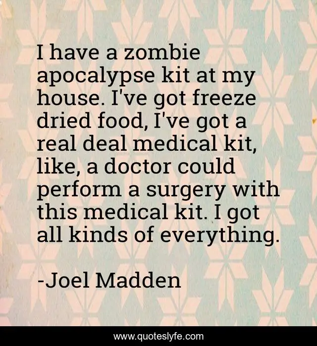 This page presents the quote "I have a zombie apocalypse kit at my house. I've got freeze dried food, I've got a real deal medical kit, like, a doctor could perform a surgery with this medical kit. I got all kinds of everything.". Author of this quote is Joel Madden. This quote is about food, house, doctor,.