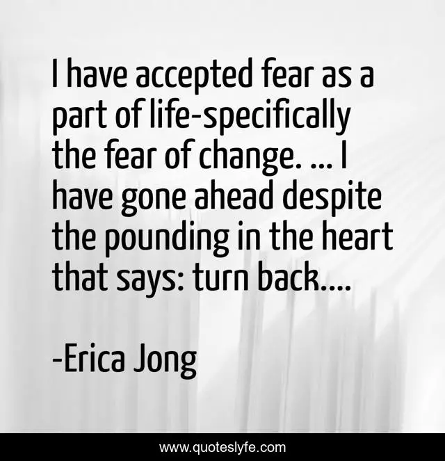 This page presents the quote "I have accepted fear as a part of life-specifically the fear of change. ... I have gone ahead despite the pounding in the heart that says: turn back....". Author of this quote is Erica Jong. This quote is about future, anxiety,.