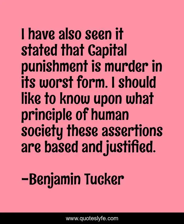 This page presents the quote "I have also seen it stated that Capital punishment is murder in its worst form. I should like to know upon what principle of human society these assertions are based and justified.". Author of this quote is Benjamin Tucker. This quote is about punishment, human,.