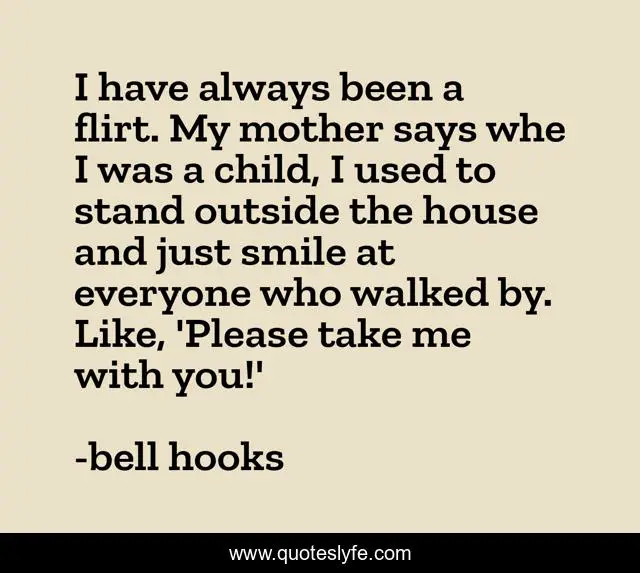 This page presents the quote "I have always been a flirt. My mother says whe I was a child, I used to stand outside the house and just smile at everyone who walked by. Like, 'Please take me with you!'". Author of this quote is bell hooks. This quote is about me, mother, child,.