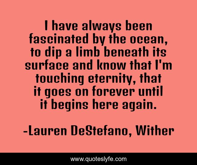 This page presents the quote "I have always been fascinated by the ocean, to dip a limb beneath its surface and know that I'm touching eternity, that it goes on forever until it begins here again.". Author of this quote is Lauren DeStefano, Wither. This quote is about romance, sciences, ya, fiction,.