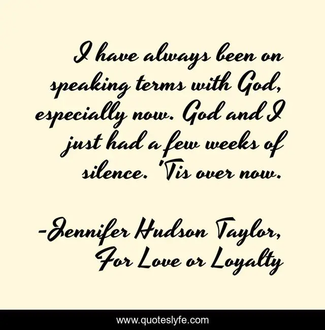 This page presents the quote "I have always been on speaking terms with God, especially now. God and I just had a few weeks of silence. 'Tis over now.". Author of this quote is Jennifer Hudson Taylor, For Love or Loyalty. This quote is about god, silence, speaking, prayer,.