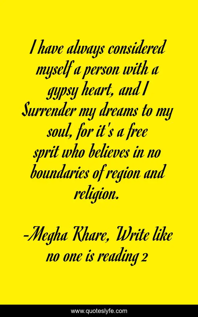 This page presents the quote "I have always considered myself a person with a gypsy heart, and I Surrender my dreams to my soul, for it's a free sprit who believes in no boundaries of region and religion.". Author of this quote is Megha Khare, Write like no one is reading 2. This quote is about heart, religion, considered, region, soul, gypsy, spirit, dreams,.