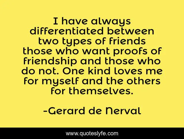 This page presents the quote "I have always differentiated between two types of friends those who want proofs of friendship and those who do not. One kind loves me for myself and the others for themselves.". Author of this quote is Gerard de Nerval. .