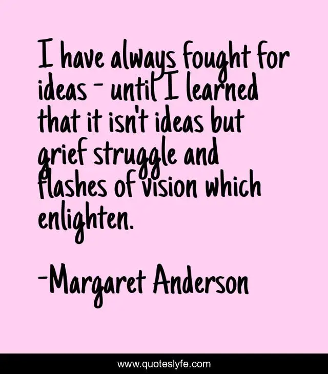 This page presents the quote "I have always fought for ideas - until I learned that it isn't ideas but grief struggle and flashes of vision which enlighten.". Author of this quote is Margaret Anderson. .