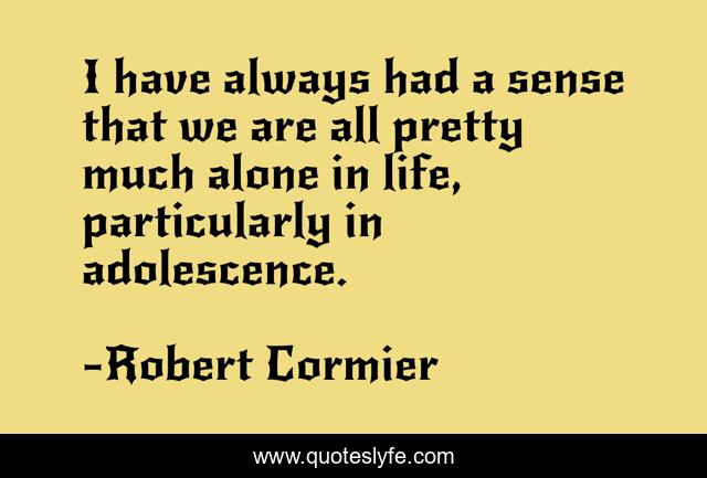This page presents the quote "I have always had a sense that we are all pretty much alone in life, particularly in adolescence.". Author of this quote is Robert Cormier. This quote is about alone, life, adolescence,.