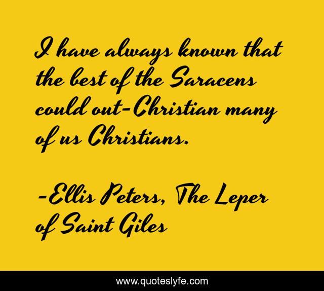 This page presents the quote "I have always known that the best of the Saracens could out-Christian many of us Christians.". Author of this quote is Ellis Peters, The Leper of Saint Giles. This quote is about crusades, openmindedness, christianity, religion, goodness, equality, tolerance,.