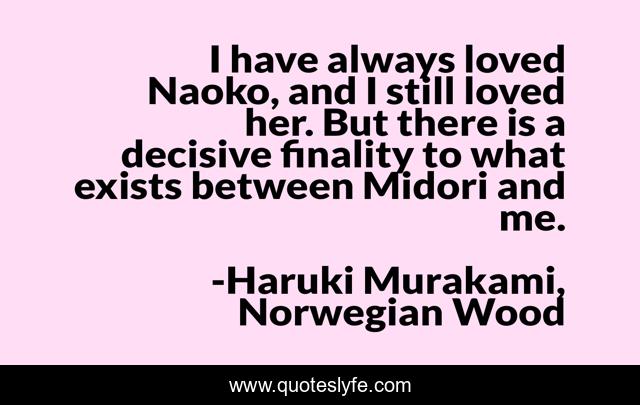 This page presents the quote "I have always loved Naoko, and I still loved her. But there is a decisive finality to what exists between Midori and me.". Author of this quote is Haruki Murakami, Norwegian Wood. This quote is about books, book, norwegian-wood,.