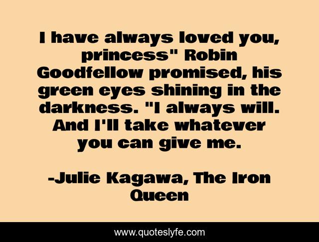 This page presents the quote "I have always loved you, princess" Robin Goodfellow promised, his green eyes shining in the darkness. "I always will. And I'll take whatever you can give me.". Author of this quote is Julie Kagawa, The Iron Queen. This quote is about faerie, puck, paranormal-romance,.