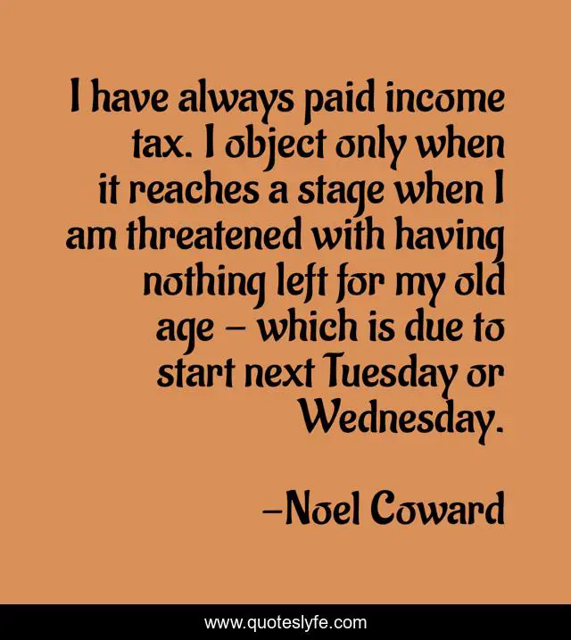 This page presents the quote "I have always paid income tax. I object only when it reaches a stage when I am threatened with having nothing left for my old age - which is due to start next Tuesday or Wednesday.". Author of this quote is Noel Coward. This quote is about wednesday, old age,.