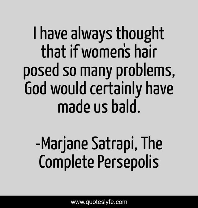This page presents the quote "I have always thought that if women's hair posed so many problems, God would certainly have made us bald.". Author of this quote is Marjane Satrapi, The Complete Persepolis. This quote is about womanhood, controversy, hair, religion, hijab, islam, veil, religious-beliefs, women,.
