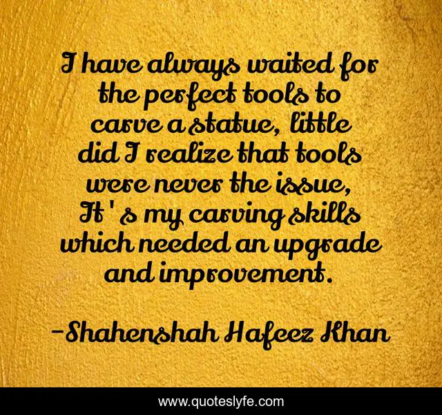 This page presents the quote "I have always waited for the perfect tools to carve a statue, little did I realize that tools were never the issue, It's my carving skills which needed an upgrade and improvement.". Author of this quote is Shahenshah Hafeez Khan. This quote is about waiting, improvement, realization,.