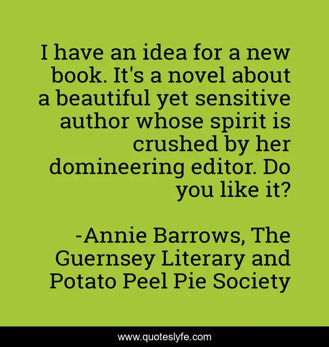 This page presents the quote "I have an idea for a new book. It's a novel about a beautiful yet sensitive author whose spirit is crushed by her domineering editor. Do you like it?". Author of this quote is Annie Barrows, The Guernsey Literary and Potato Peel Pie Society. This quote is about book, humor, editor, author,.