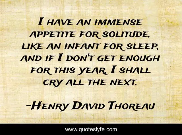 This page presents the quote "I have an immense appetite for solitude, like an infant for sleep, and if I don't get enough for this year, I shall cry all the next.". Author of this quote is Henry David Thoreau. .