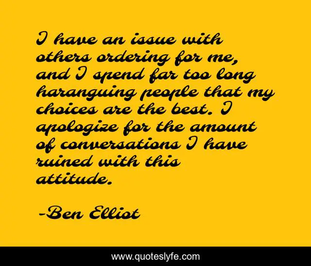 This page presents the quote "I have an issue with others ordering for me, and I spend far too long haranguing people that my choices are the best. I apologize for the amount of conversations I have ruined with this attitude.". Author of this quote is Ben Elliot. This quote is about me, best, choices,.