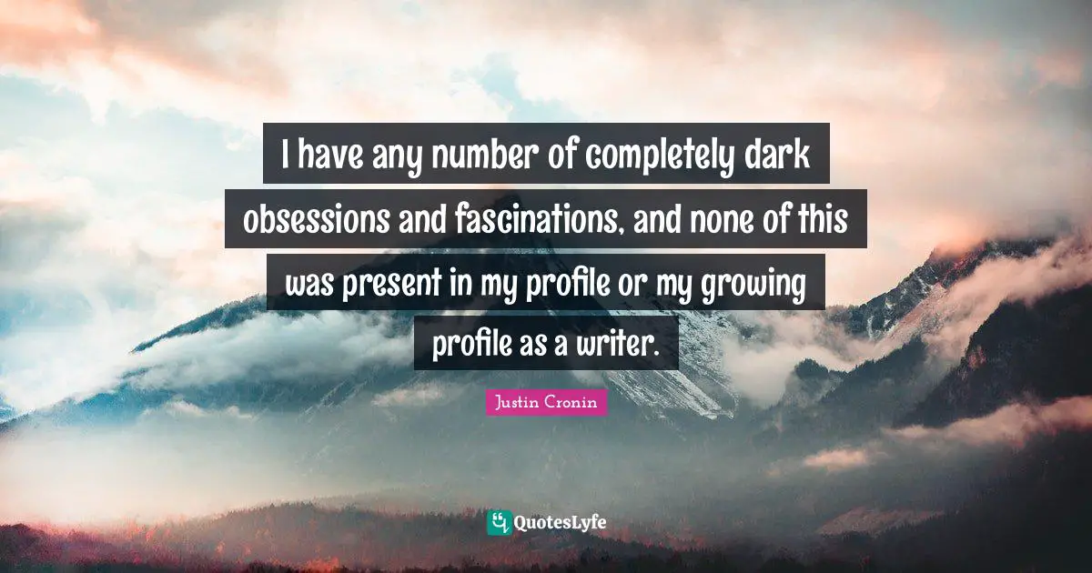 This page presents the quote "I have any number of completely dark obsessions and fascinations, and none of this was present in my profile or my growing profile as a writer.". Author of this quote is Justin Cronin. This quote is about dark, fascination, growing, profile, numbers,.