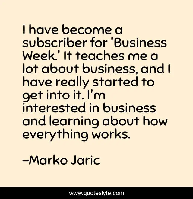 This page presents the quote "I have become a subscriber for 'Business Week.' It teaches me a lot about business, and I have really started to get into it. I'm interested in business and learning about how everything works.". Author of this quote is Marko Jaric. This quote is about week, me, business,.