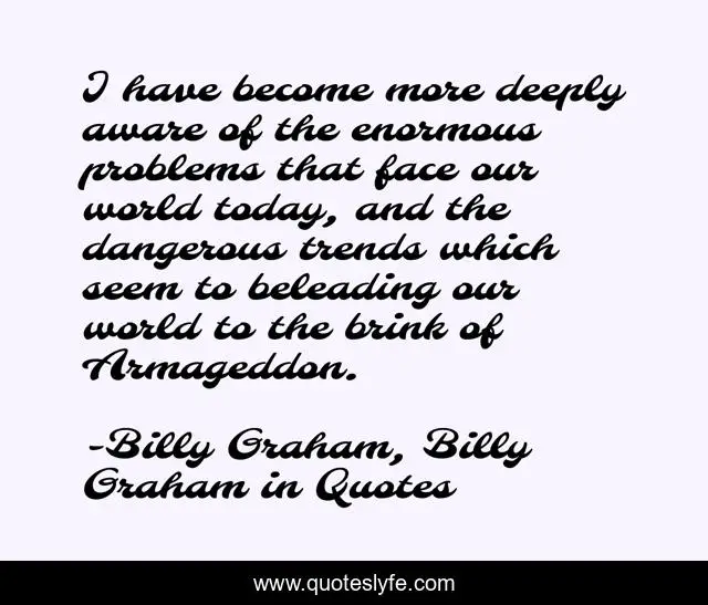 This page presents the quote "I have become more deeply aware of the enormous problems that face our world today, and the dangerous trends which seem to beleading our world to the brink of Armageddon.". Author of this quote is Billy Graham, Billy Graham in Quotes. This quote is about armageddon, end-times, billy-graham,.